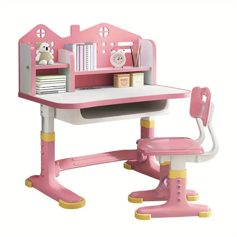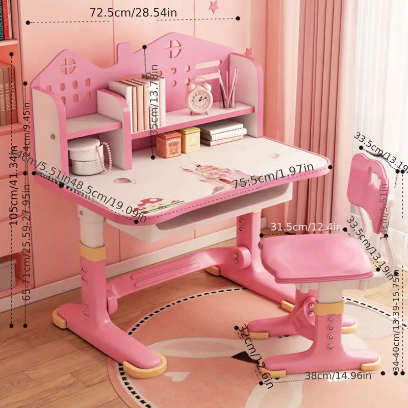 Adjustable Kids Study Desk & Chair Set – Pink Castle Design with Storage